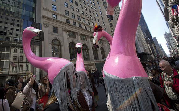 People wear pink flamingo hats as they attend the annual Easter Bonnet Parade in New York,USA. Reuters Archive.