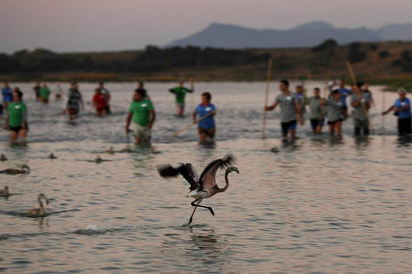 Volunteers wade across the lagoon at dawn to gather flamingo chicks and place them inside a corral at the Fuente de Piedra natural reserve, near Malaga, southern Spain. Reuters Archive.