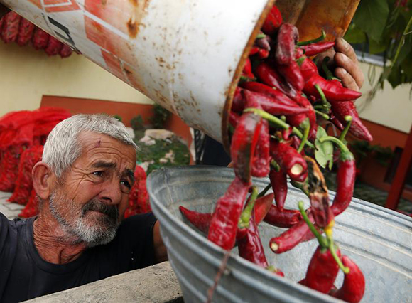A paprika maker pours freshly picked peppers into a drying sock in Batya, 140km south of Budapest, Hungary. Reuters Archive.