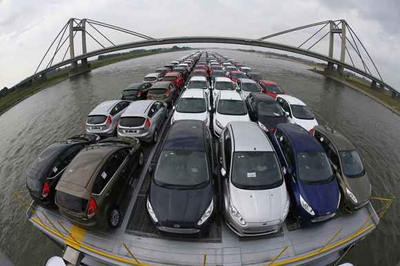 Newly manufactured Ford Fiesta cars are seen on the deck of the car transport ship «Tossa» as it travels along the Rhine, from a Ford plant in the German city of Cologne to the Dutch seaport of Vlissingen, close to Nimwegen in the Netherlands. Reuters Archive.