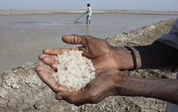 A labourer holds salt crystals at a salt pan in Navapura village, about 155 km (96 miles) west of the western Indian city of Ahmedabad, India. Reuters Archive.