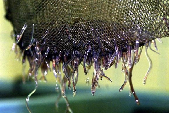 A French fisherman holds a netful of baby eels or ‘pibales’, Bordeaux, France. Reuters Archive.