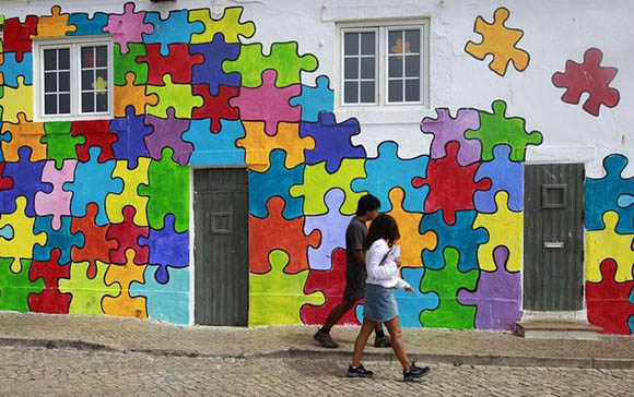 People walk past a house painted in a puzzle pattern in Eiriceira village North of Lisbon, Portugal. Reuters Archive.