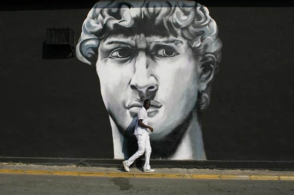 A man walks past a wall mural outside a furniture shop in Tomares, close to Seville, Spain. Reuters Archive.