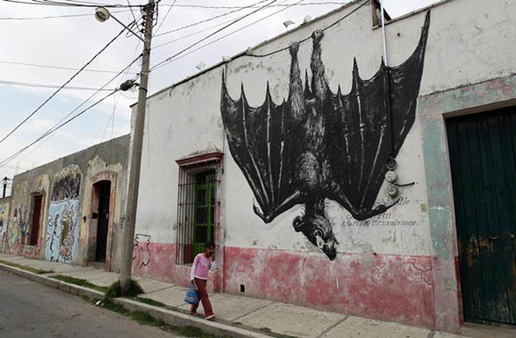 A girl walks on a street beside a wall painted with a mural of a bat in San Pedro Cholula near Mexico City. Reuters Archive.