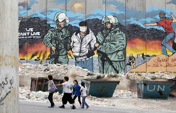 Children walk in front of a mural painted on part of Israel’s controversial barrier at Aida refugee camp in the West Bank town of Bethlehem, ahead of Nakba, West Bank. Reuters Archive.
