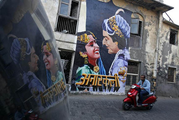 A man rides a motorbike past a mural of the classic Bollywood movie «Anarkali» on the wall of a building in Mumbai, india. Reuters Archive.