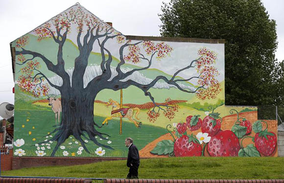 A man walks past a mural painted on the end of a row of terraced houses in Birmingham, central England. Reuters Archive.