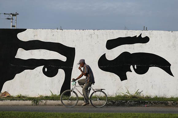 A man rides a bicycle in front of a campaign mural promoting Venezuelan President Hugo Chavez in Barinas, Venezuela. Reuters Archive.