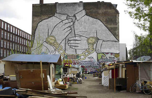 Shanties are pictured on a wasteland used by squatters at Cuvrystrasse in front of a mural by Italian artist Blu at Kreuzberg district in Berlin, Germany. Reuters Archive.
