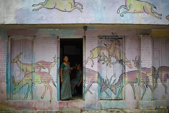 A school teacher smiles as she calls her friend (unseen) while standing by the door of a school along the streets in Kathmandu, Nepal. Reuters Archive.
