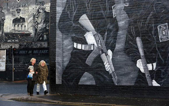 Women walk past a Loyalist Paramilitary mural on the Newtonard’s Road area of East Belfast, Northern Ireland. Reuters Archive.