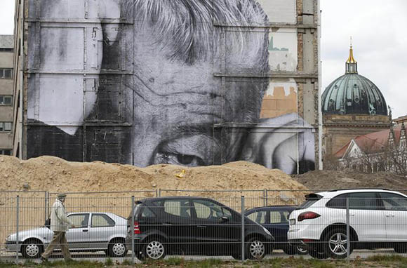 A man walks beside a creation by French artist J.R. near the Berlin cathedral in Berlin, Germany. Reuters Archive.