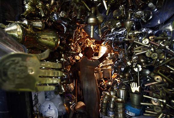 A man works in his shop selling traditional handmade copperware in Souq al-Safafeer in Najaf , Irak. May 9, 2014