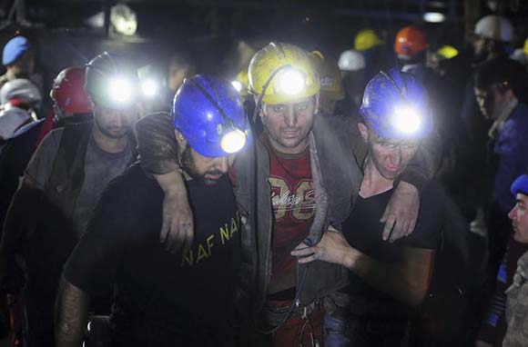An injured miner is carried to an ambulance after being rescued from a coal mine he was trapped in, in Soma, a district in Turkey’s western province of Manisa, 300 miners have died in this accident. May 14, 2014