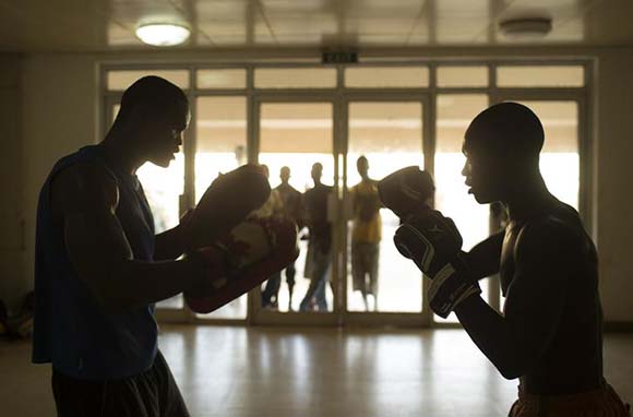 Men take part in Thai boxing training at the Barthelemy Boganda stadium in the capital of Bangui, Central African Republic. May 14, 2014