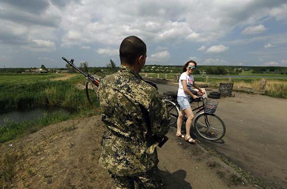 A woman smiles at a pro-Russian rebel guarding a rebel-held position on the outskirts of the eastern Ukrainian town of Slaviansk, Ukraine. May 15, 2014