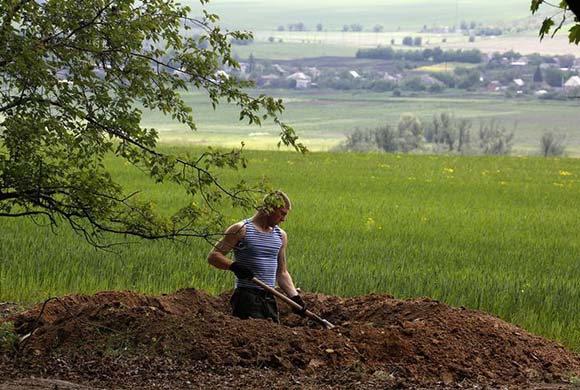 An Ukrainian soldier digs a trench outside the village of Bylbasivka near the eastern Ukrainian town of Slaviansk at a Ukrainian army controled area. May 15, 2014
