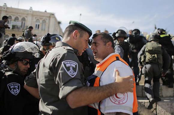 A Palestinian medic argues with an Israeli border policeman during a demonstration marking the 66th anniversary of the «Nakba,» meaning catastrophe, when many Palestinians fled or were expelled from their towns and villages during the war of Israel’s foundation in 1948, at Damascus Gate in Jerusalem’s Old City. May 15, 2014