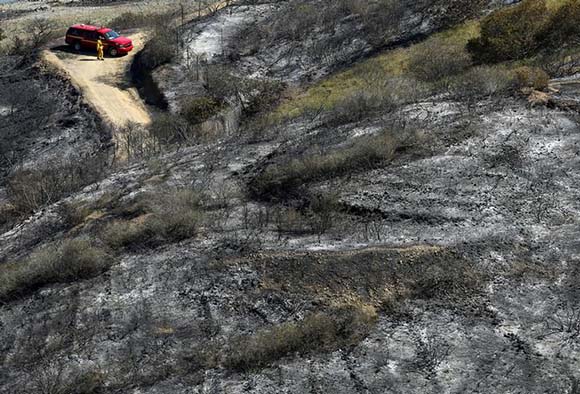 Fire personnel inspect a burned-out area in the hills around San Marcos, California, USA. May 15, 2014