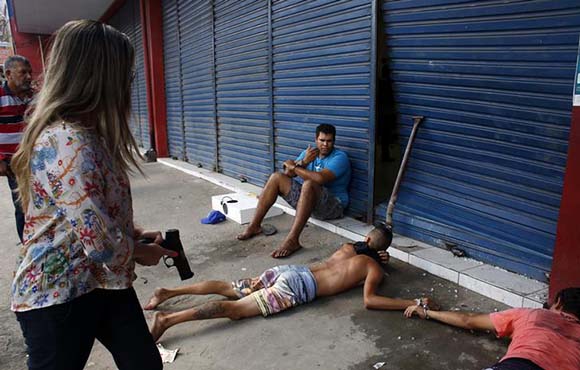 A civil police officer detain young suspects after a store was looted during a police strike in Recife, Brazil. May 15, 2014