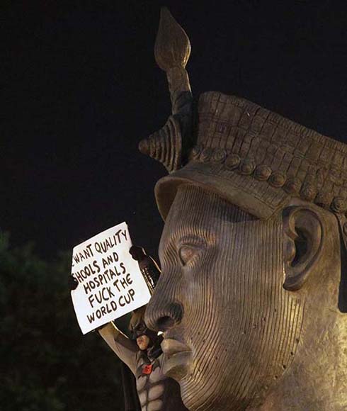 An anti-government demonstrator dressed as comic book character Batman holds a banner atop a monument of former slave Zumbi dos Palmares during a protest against 2014 World Cup in Rio de Janeiro, Brazil. May 15, 2014