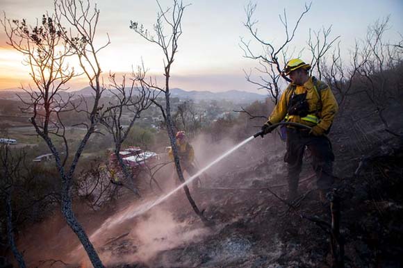 Fire crew put out smouldering embers from the Cocos Fire in San Marcos, California, USA. May 15, 2014