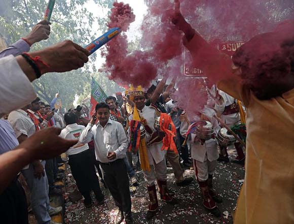 Supporters of the India’s Bharatiya Janata Party (BJP) celebrate after learning of the poll results outside the party headquarters in New Delhi, India. May 16, 2014