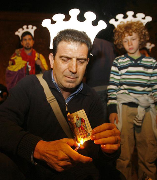 A man burns the king of a Spanish deck of cards in central Madrid, Spain. Reuters archive