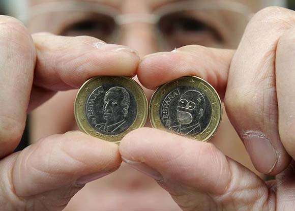 Candy shop owner Jose Martinez shows an official Spanish 1 Euro coin with the face of Spanish King Juan Carlos (L) and another one altered to look like a face of cartoon character Homer Simpson in the northern Spanish town of Avile. Reuters archive