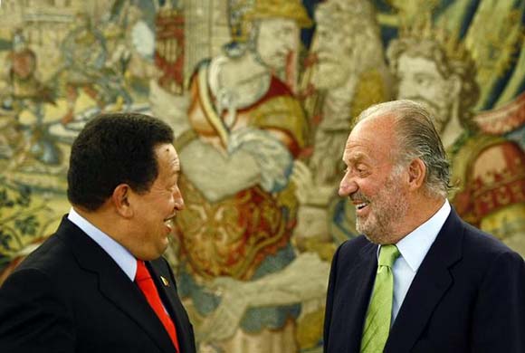 Spain’s King Juan Carlos (R) talks to Venezuela’s President Hugo Chavez at the Zarzuela Palace in Madrid, Spain. Reuters archive
