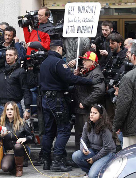 A policeman pushes a protester holding a banner in front of the exit of a hospital from which Spain’s King Juan Carlos was discharged in Madrid, Spain. Reuters archive