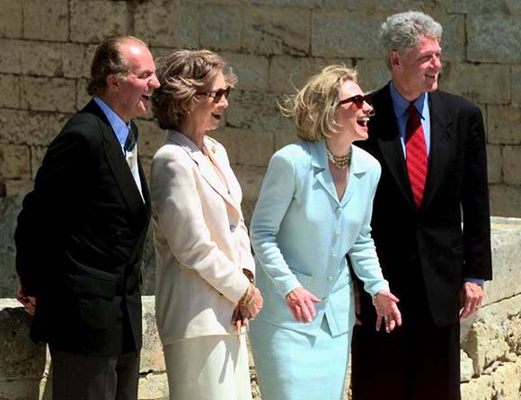 U.S. President Bill Clinton (R) and first lady Hillary Rodham Clinton (2R) enjoy a laugh with King Juan Carlos (L) of Spain and Queen Sophia during a tour of the 14th century Bellver Castle, Palma de Mallorca, Spain. Reuters archive