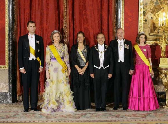 (L-R): Spanish Crown Prince Felipe, Spanish Queen Sofia, Mexican First Lady Margarita Zavala, Mexican President Felipe Calderon, Spanish King Juan Carlos and Spanish Princess Letizia pose for photographers before their dinner at Madrid’s Royal Palace. Reuters archive