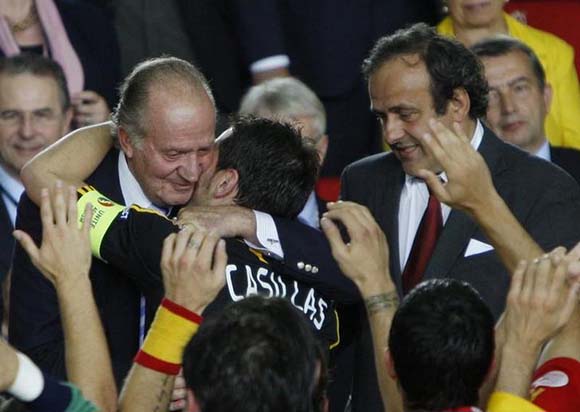 Spain’s captain Iker Casillas (C) embraces Spain’s King Juan Carlos (L) as UEFA President Michel Platini looks on after their Euro 2008 final soccer match victory over Germany at Ernst Happel Stadium in Vienna, Austria. Reuters archive