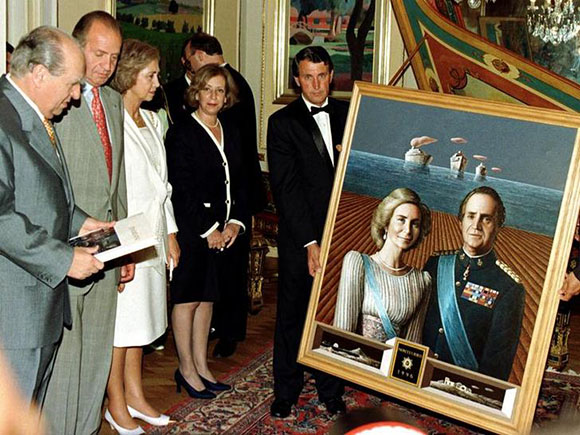 Spanish King Juan Carlos and Queen Sofia receive a painting commemorating their visit from Uruguayan President Julio Maria Sanguinetti (L) and his wife Marta Canessa (R) at the presidential residence, Montevideo, Uruguay. Reuters archive