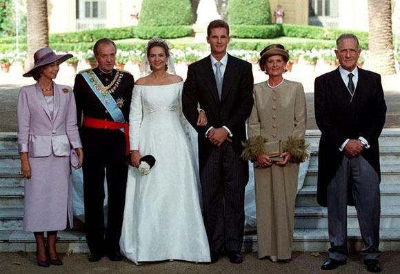 (L-R) Spain’s Queen Sofia, King Juan Carlos, Princess Cristina, Inaki Urdangarin, Claire Liebaert Courtin and Juan Maria Urdangarin, the mother and father of Inaki, pose for a wedding photograph. Reuters archive