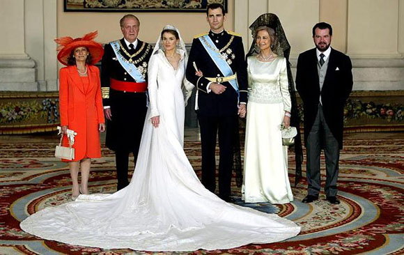 Spanish Crown Prince Felipe (3rd R) and his wife Letizia Ortiz (3rd L), Princess of Asturias, pose for photographers along their parents King Juan Carlos (2nd L), Queen Sofia (2nd R), Jesus Ortiz (R) and Paloma Rocasolano at Madrid’s Royal Palace, Spain. Reuters archive
