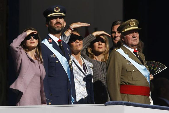 Members of the Spanish royal family (L-R) Princess Letizia, Crown Prince Felipe, Infanta Elena, Infanta Cristina and King Juan Carlos watch a military parade during Spain’s National Day in Madrid, Spain. Reuters archive