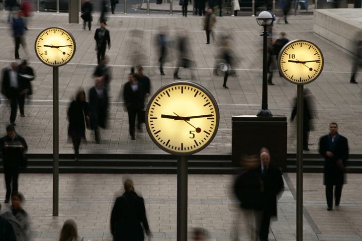 People walk past clocks at Reuters Plaza in London in this undated handout photo. Reuters Archive.