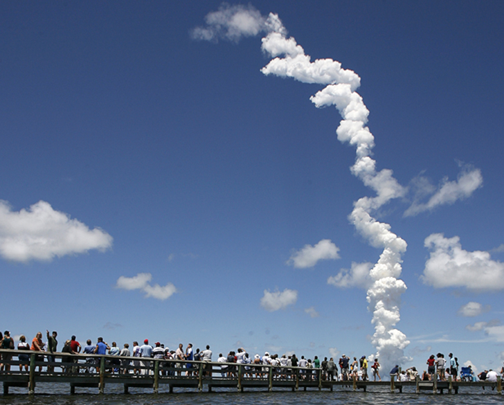 People watch as the space shuttle Discovery leaves a trail of smoke during its launch at the Kennedy Space Center in Cape Canaveral, Florida, USA. Reuters Archive.