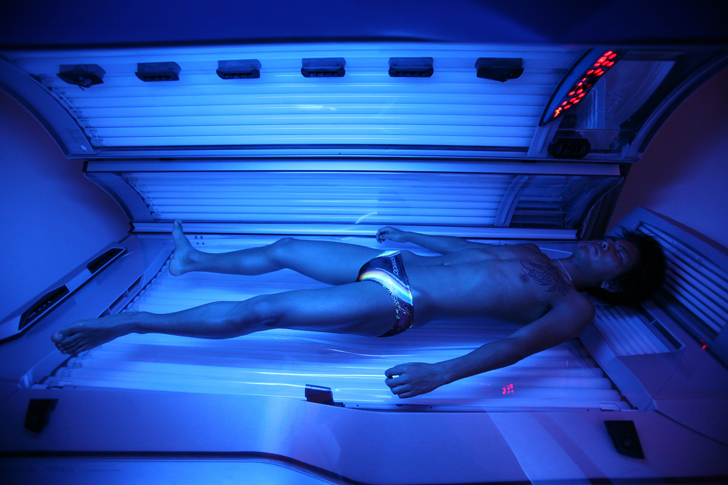 A man lies on a tanning bed as he begins a session at a tanning salon in Shanghai, China. Reuters Archive.