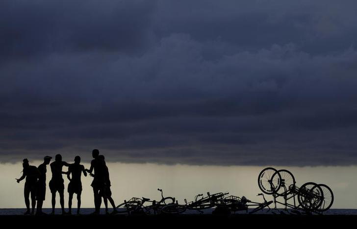 Youths stand on Havana’s seafront boulevard «El Malecon» as a storm approaches, Cuba. Reuters Archive