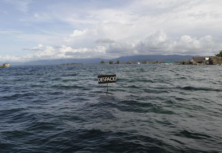 A traffic sign reading ‘Slow down’ is seen between islands at the Comarca of Kuna Yala in Panama. Reuters Archive. |