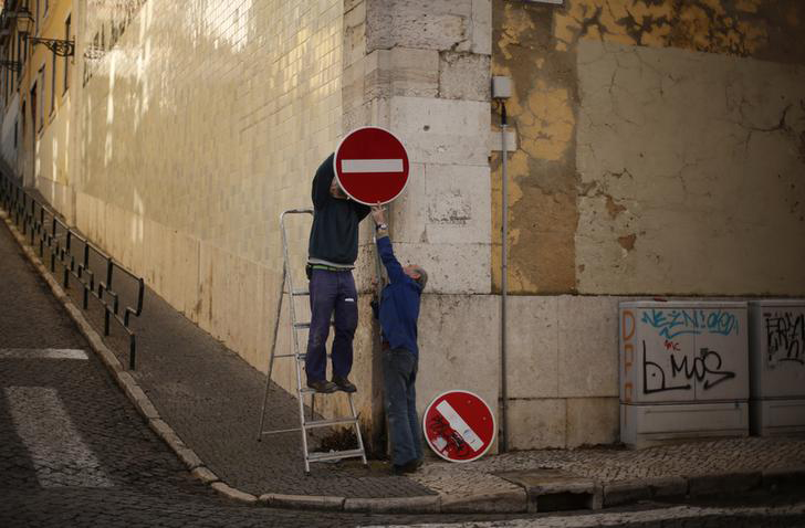 Municipal workers change a traffic sign in downtown Lisbon, Portugal. Reuters Archive