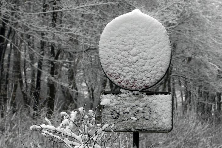 A snow covered traffic sign is pictured at the motorway in Bochum, Germany. Reuters Archive.