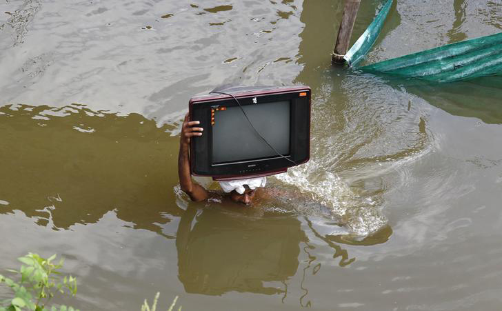 A flood-affected man carries his television set to a safer place, after heavy monsoon rains caused a rise in the water levels of the river Ganges, in the northern Indian city of Allahabad. Reuters Archive.