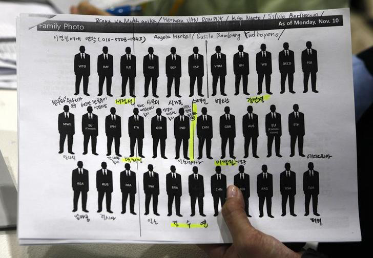 A piece of paper which shows the standing positions of members of the G20 for the family photo session is seen at the G20 Summit in Seoul, South Korea. Reuters Archive |