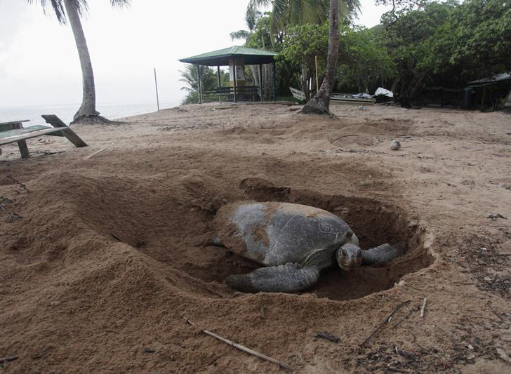 A green sea turtle (Chelonia mydas), known locally as the krape, nests on Babunsanti Beach in the Galibi nature reserve situated on the eastern edge of the Marowijne River, Suriname. Reuters Archive
