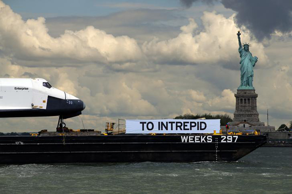The Space Shuttle Enterprise passes the Statue of Liberty as it rides on a barge in New York harbor, USA. Reuters Archive